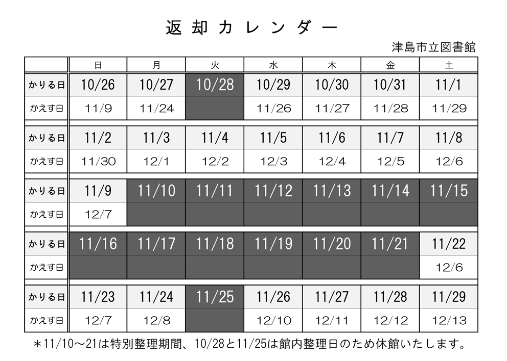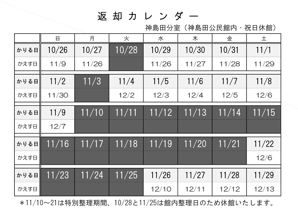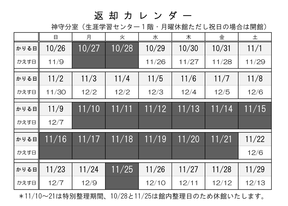 10月27日(月)~11月9日(日)に貸出した資料は、4週間の貸出となります。 相互貸借資料は除きます。